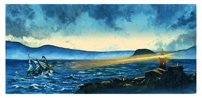 La por­ta­da y con­tra­por­ta­da mues­tran la boca­na de la ría de Avilés con el faro de San Juan ilu­mi­nan­do un bar­co que es ata­ca­do por el temi­ble “pelu­dín”, con la isla de la Deva al fondo.